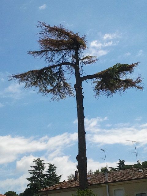 Ora no. Si abbattono senza pietà in ogni stagione dell’anno, si fanno potature “criminali” (passami il termine eccessivo), sia sulle alberature pubbliche che su quelle private, senza porsi troppi problemi. Curare alberi malati? costa troppo… meglio l’’eutanasia’. Sostenere i grandi e vecchi rami degli alberi monumentali, come avviene all’estero, in tutti i paesi dell’Europa del Nord, ad esempio (ma non solo)? neppure a parlarne. I vecchi tronchi hanno spesso delle cavità: si può intervenire limitando peso e altezza, ma salvando gli alberi, magari collocando supporti o cerchiature? Meno impegnativo usare la sega elettrica. E, ormai, è un concerto, quello delle seghe elettriche, che non conosce sosta, in nessuna stagione dell’anno. Si taglia, si capitozza anche fuori stagione. Poi gli alberi muoiono e il problema è risolto. La sostituzione? spesso con varietà che crescono stancamente e lentissimamente per pochi metri, che hanno chiome scarne, che non fanno ombra. Si asfaltano anche le poche banchine in terra superstiti nelle vie urbane: tutto è foderato perfettamente, così da riflettere il calore, impedire l’assorbimento dell’acqua piovana, salvo poi lamentarsi per le vie ridotte a fiumi in occasione degli acquazzoni tropicali che sono sempre più frequenti. Una volta esistevano i Verdi: ora nessuna voce, se non qualcuna isolata come la mia, si leva a difesa di questi insostituibili compagni di vita che sono gli alberi. Potrei farti tanti esempi, anche a Cesena. Ti mando solo due foto: una di un “ex” cedro del Libano (foto sotto), in proprietà privata (un tronco pulito e diritto di decine di metri e un triste pennacchio disseccatosi velocemente). Un pioppo secolare, unico albero della Piazzetta dedicata all’igienista Robusto Mori, discepolo di Bufalini. Albero malato, da sostenere, certamente, ma di altezza limitata, dopo precedenti tagli severissimi che lo avevano ridotto al solo tronco. Si era ripreso, nei dieci anni seguenti, con una bella chioma di 4-5 metri. Ora… solo asfalto. Mori non avrebbe certamente approvato la cosa, ma ora tutto è omogeneo con l’(ex) bellissimo viale che era intitolato a Vincenzo Angeli (indimenticato sindaco cesenate prima del fascismo): del tutto foderato d’asfalto e, per almeno 4-5 mesi l’anno con temperature da frittura in padella. Resistono tre dei vecchi alberi che fanno un’isoletta di ombra e hanno infiorescenze magnifiche. Fino a quando? Le motoseghe sono in agguato. A dispetto delle “Giornate del Paesaggio”.