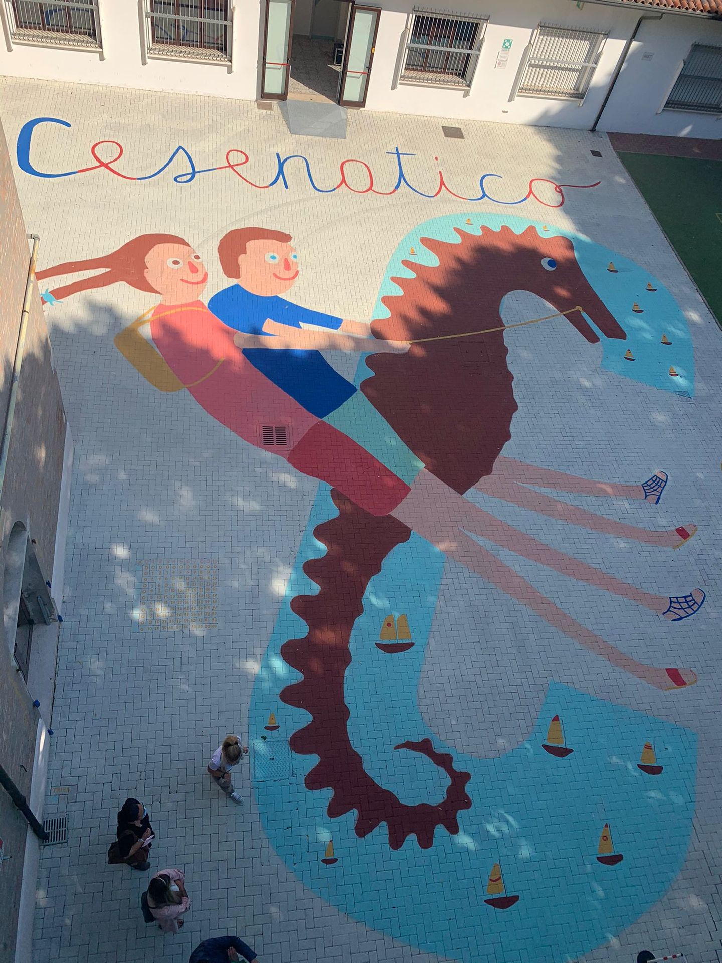 L’artista cesenaticense Simone Tribuiani ha prestato la sua mano per decorare il cortile della scuola con un grande disegno che ritrae due bambini in groppa a un cavalluccio marino. L’opera potrà essere utilizzato dai bambini anche come gioco. L’idea è partita da un gruppo di genitori ed è stata appoggiata con entusiasmo dalla preside Simonetta Ferrari. L’Amministrazione comunale, tramite l’Ufficio scuola e la Cesenatico Servizi, ha supportato l’intervento, che rimarrà permanente. I colori sono stati forniti dall’azienda “Giglioli colori”.