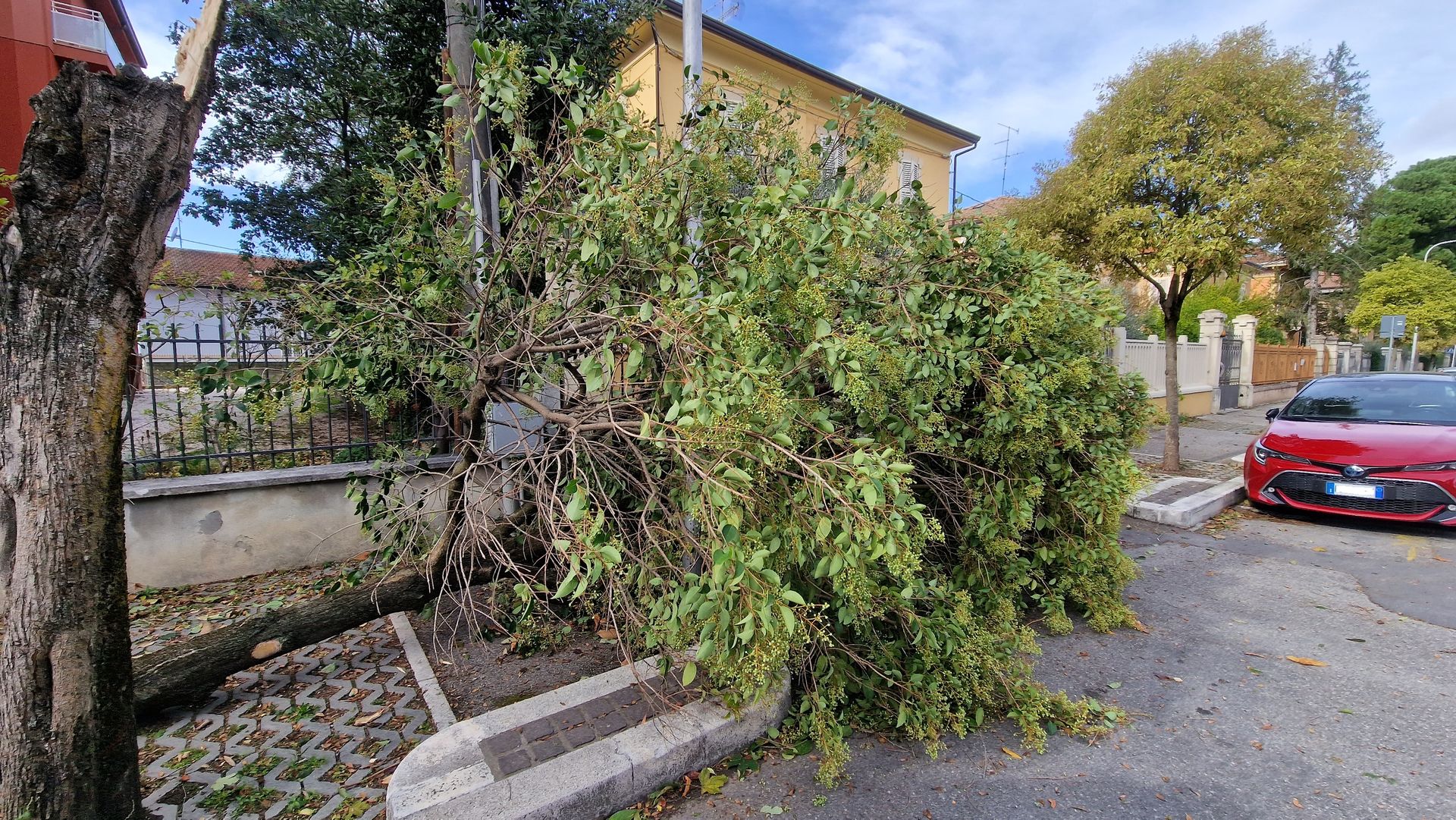 Nella foto in alto, una pianta caduta questa mattina in via Don Minzoni, a Cesena, con gli operai del Comune che hanno già messo in sicurezza il marciapiedi. Nella foto sotto, un’altra pianta, caduta poco oltre nella stessa via, che sta intralciando il camminamento.