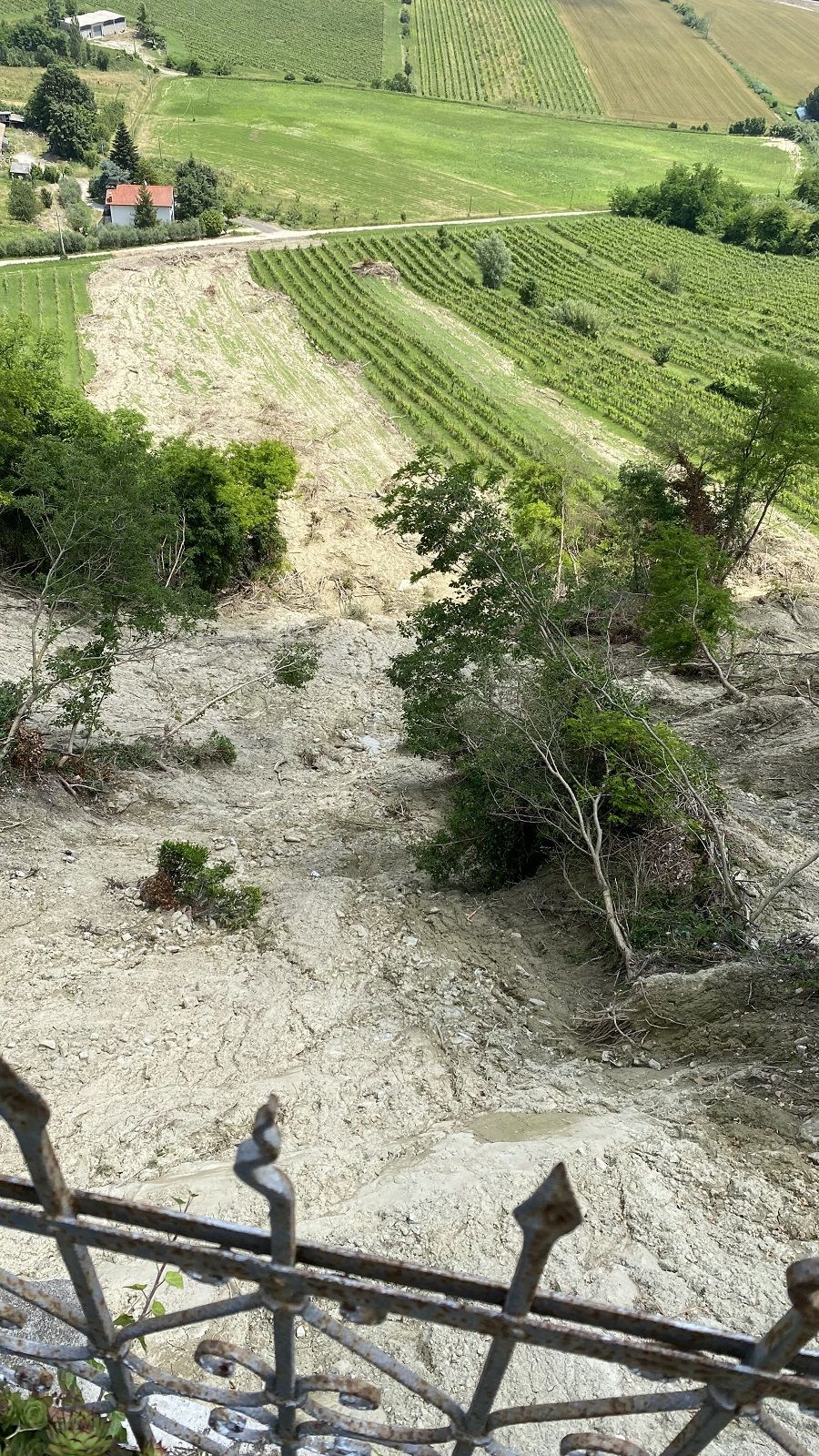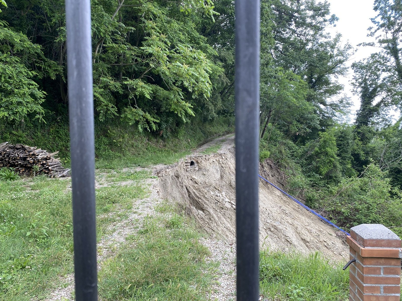 Torniamo alle nostre strade collinari martoriate. La via Garampa che dalla città sale fino a Diolaguardia, passando per i Cappuccini, Acquarola, Montereale, è costellata di frane. Alcune sono molto vistose e restringono la carreggiata. Altre si intravedono a distanza e minacciano case e magazzini. Oltre un cancello che delimita una proprietà privata, una porzione di viale è finita a valle. Il vuoto creatosi è impressionante (foto).