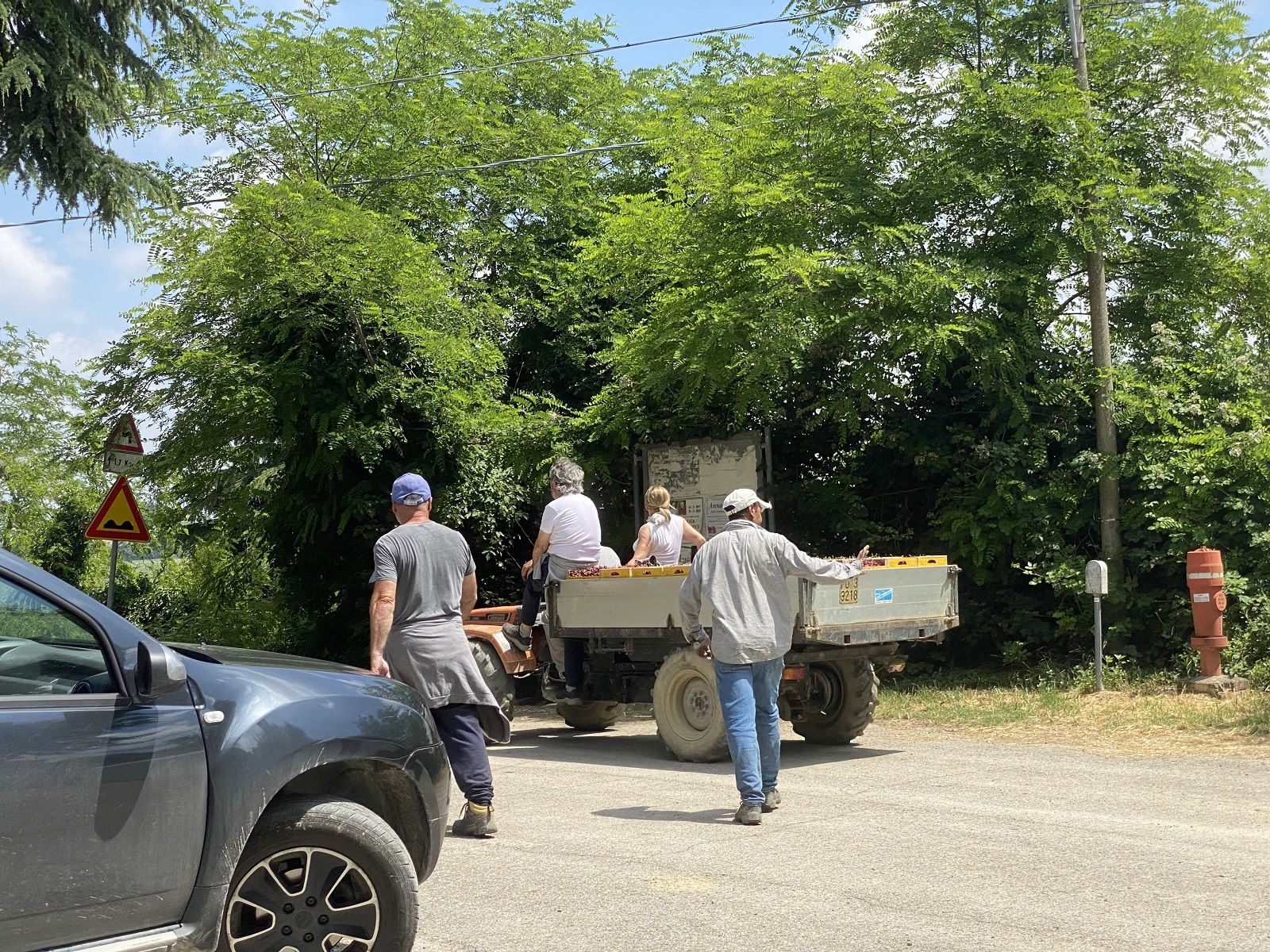Bruno Strofanti è costretto a vivere in auto. La sua abitazione è inagibile. Racconta che sono già stati eseguiti due interventi di ripristino, ma ce ne vorrebbe un terzo. In ogni caso, precisa, “i Vigili del fuoco ci hanno aiutato tantissimo”. Nella piazzetta principale si sono radunati alcuni residenti, per lo più anziani. Narrano delle loro difficoltà, ma pensano anche a chi sta peggio di loro. Ivan Bartoletti Stella, direttore della Caritas diocesana, con la moglie Floriana Tappi si offre per alcuni aiuti concreti che gli abitanti di Ardiano dicono di dirottare su altri che stanno peggio e hanno perso tutto. La pioggia del giorno precedente (mercoledì 7 giugno) ha reso molto pericolosa e sconsigliata la famosa corta che conduce nel fondovalle del Pisciatello-Urgon che è stata chiusa di nuovo. Adesso vi transitano solo i residenti con i mezzi da campagna che utilizzano per la raccolta delle ciliegie (foto).