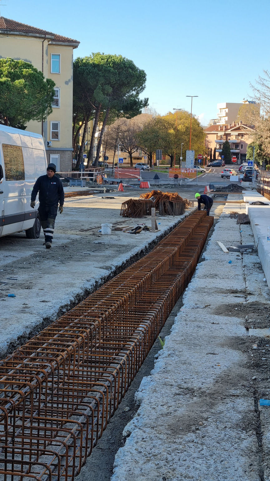 Proseguono intanto i lavori, dal costo complessivo di 2,5 milioni di euro. L’attraversamento dei 421 metri di lunghezza (per una pendenza media di 3,5 per cento) che collegano la parte da via Assano, in zona Montefiore, e la zona delle scuole e dell’albergo Casali (piazzale Macrelli), si svolge tra operai che stanno terminando l’armatura delle solette in vista della gettata di calcestruzzo, a completare il calpestìo. Asfalto (rosso per la pista ciclabile) e il montaggio dei parapetti – più alto e in parte oscurato per la parte che passa sopra la ferrovia – completeranno l’opera la cui chiusura dell’aprile scorso ha reso necessario un’importante riorganizzazione del traffico cittadino, considerando anche la presenza in zona di diversi istituti scolastici.