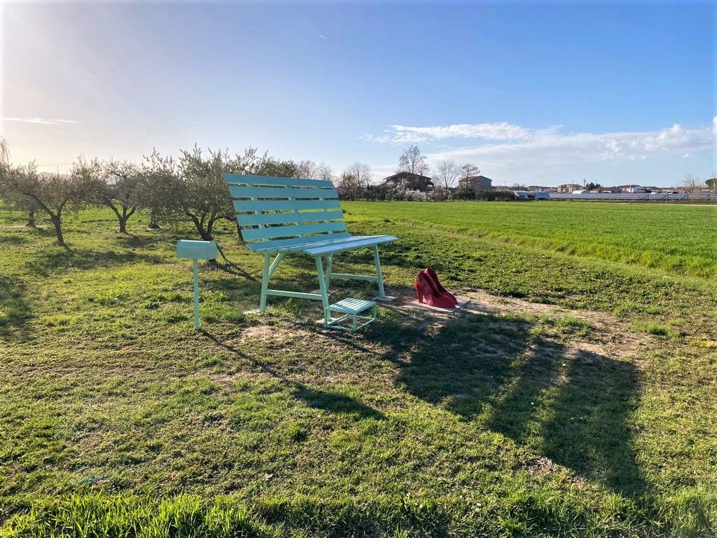 Nella foto, maxi panchina e maxi scarpe rosse per sensibilizzare sul tema della violenza contro le donne allestite da un privato, nel proprio terreno, in via Roncolo, fra Longiano e Gambettola.