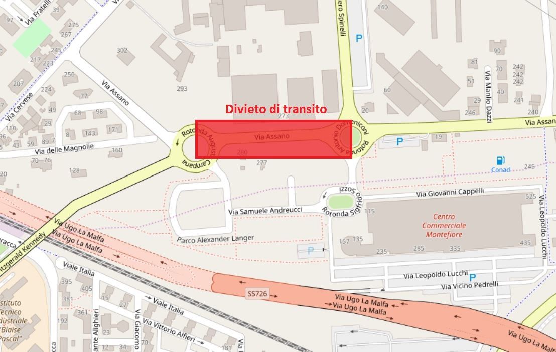 Due giorni di chiusura per via Assano, dalla fine del viadotto Kennedy fino alla rotonda di ingresso al centro commerciale.